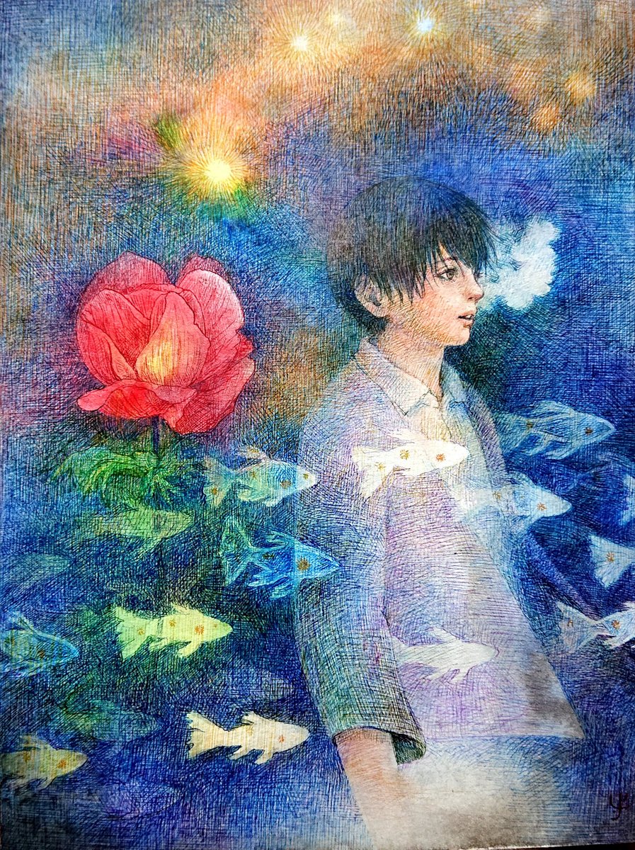あゆみ ペン 水彩 岩絵具 花の情 ちょうど花から魂がでたみたいに見えたので そもそもは宮沢賢治の春と修羅を見て描きはじめたんですが全然違うものになってしまいました ペン画 水彩画 少年 イラスト リキテックスリキッド ウィンザーアンド
